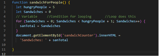 This code shows how a loop would work if you were to use it to make sandwiches and you had 5 hungry people